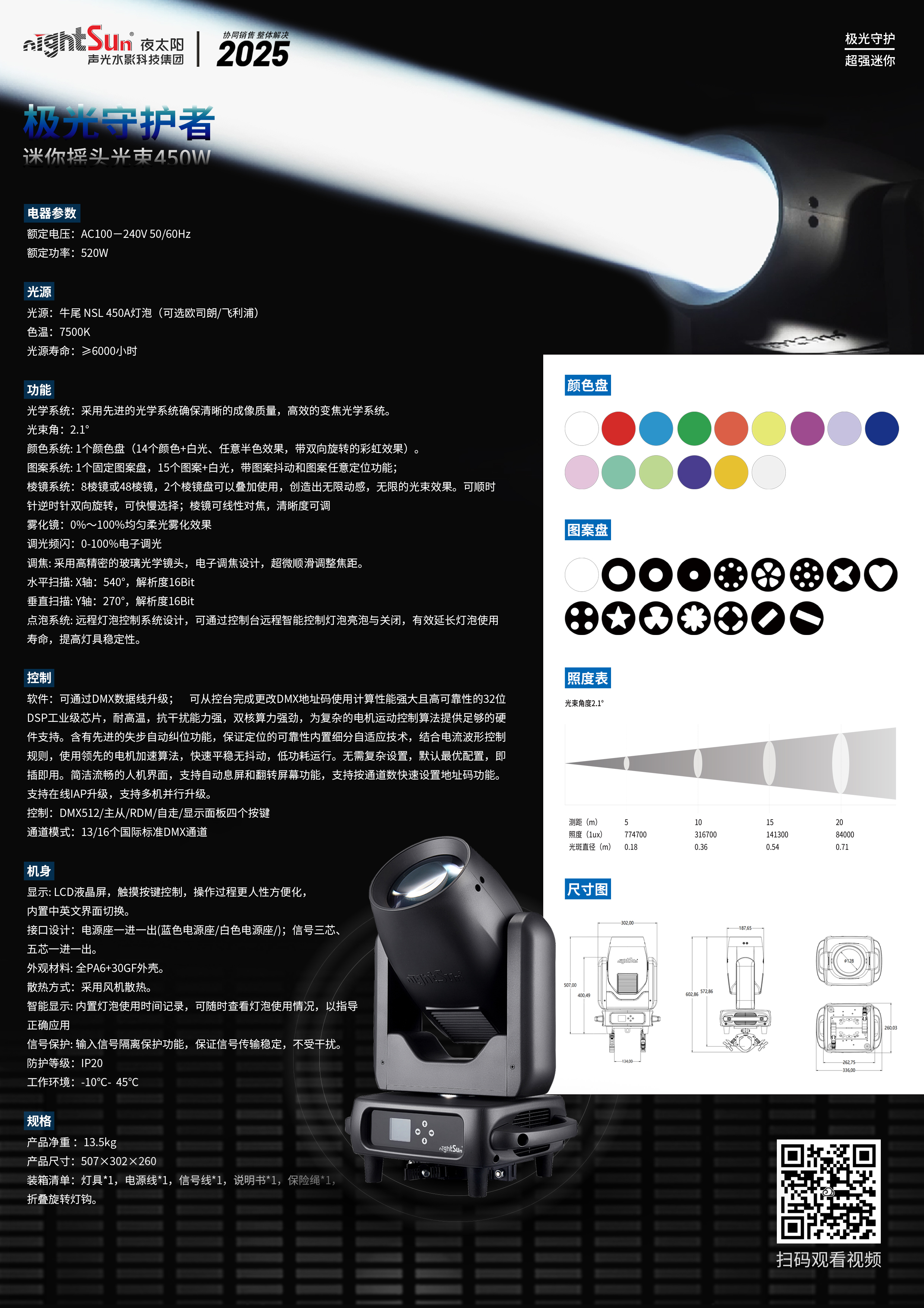 全增强尼龙外壳,经受严苛考验,电源信号双回路,稳定不掉链,450W高亮光源,7500K纯净白色。
